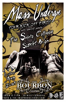 . Friday, August 21st IMU presents MASS UNDERGOE Tour Kick Off Party w/ special guests The SAINTS COLLAPSE & SCARLET REIGN @ The Bourbon, 50 West Cordova . Early show 8-11pm sharp / Purchase advance tickets directly via the bands & online @ www.imuproductions.com