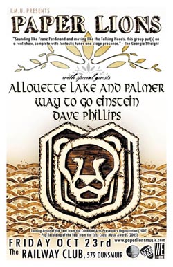 . Friday, October 23rd IMU presents PAPER LIONS, ALLOUETTE LAKE AND PALMER, WAY TO GO EINSTEIN & DAVE PHILLIPS @ The Railway Club, 579 Dunsmuir . Doors 9pm / Cover $10 @ the door