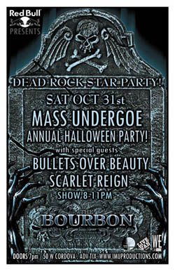 . Saturday, October 31st IMU presents DEAD ROCK STAR HALLOWEEN PARTY! MASS UNDERGOE'S ANNUAL HALLOWEEN PARTY w/ special guests BULLETS OVER BEAUTY & SCARLET REIGN @ The Bourbon, 50 West Cordova . Early show 8-11pm sharp / Purchase $12 advance tickets directly via the bands & online @ www.imuproductions.com . $15 Cover @ the door