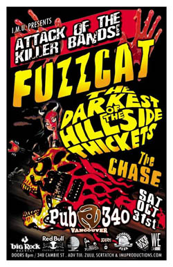 . Saturday, October 31st IMU presents ATTACK OF THE KILLER BANDS! FUZZCAT, The DARKEST OF THE HILLSIDE THICKETS & The CHASE @ PUB 340, 340 Cambie Street . Doors 8pm / $10 Advance tickets available online @ www.imuproductions.com
