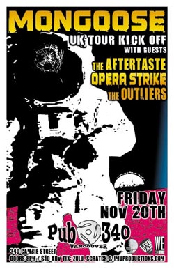 . Friday, November 20th IMU presents MONGOOSE Tour Kick Off Party w/ OPERA STRIKE, The AFTERTASTE & The OUTLIERS @ PUB 340, 340 Cambie Street . Doors 8pm / $10 Advance tickets available @ Zulu, Scratch & online @ www.imuproductions.com