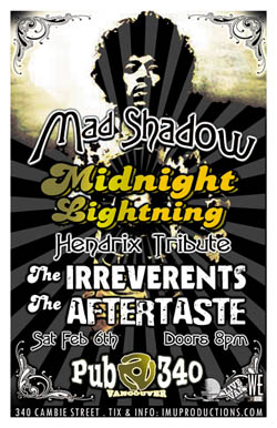 . Saturday, February 6th IMU presents MAD SHADOW, MIDNIGHT LIGHTNING Hendrix Tribute, The IRREVERENTS & The AFTERTASTE @ PUB 340, Cambie Street / Tix available directly via the bands or purchase advance tickets online @ www.imuproductions.com