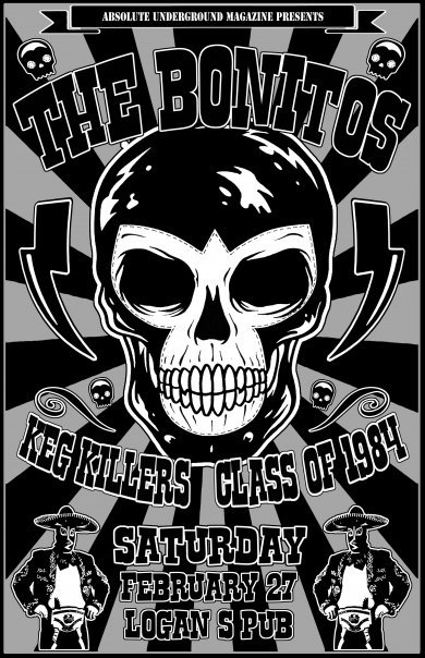Get down to the show early for the debut screening of Absolute Underground TV at 9:30 sharp. Then witness what punk is, was, and should be, as Billy Hopeless unleashes his newest musical creature...The Bonitos! (featuring ex Black Halos, Crystal Pistol, The Daggers, Black Diamond) And you know local tough guys the Keg Killers don't fuck around. Plus the movie Class of 1984 was deadly so you know the band can't be that bad.
