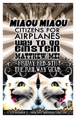 . Friday, February 5th IMU presents MIAOU MIAOU, CITIZENS FOR AIRPLANES, WAY TO GO EINSTEIN & MATTHEW MEI @ The Railway Club, 579 Dunsmuir . Doors 8pm / Cover $10 @ the door