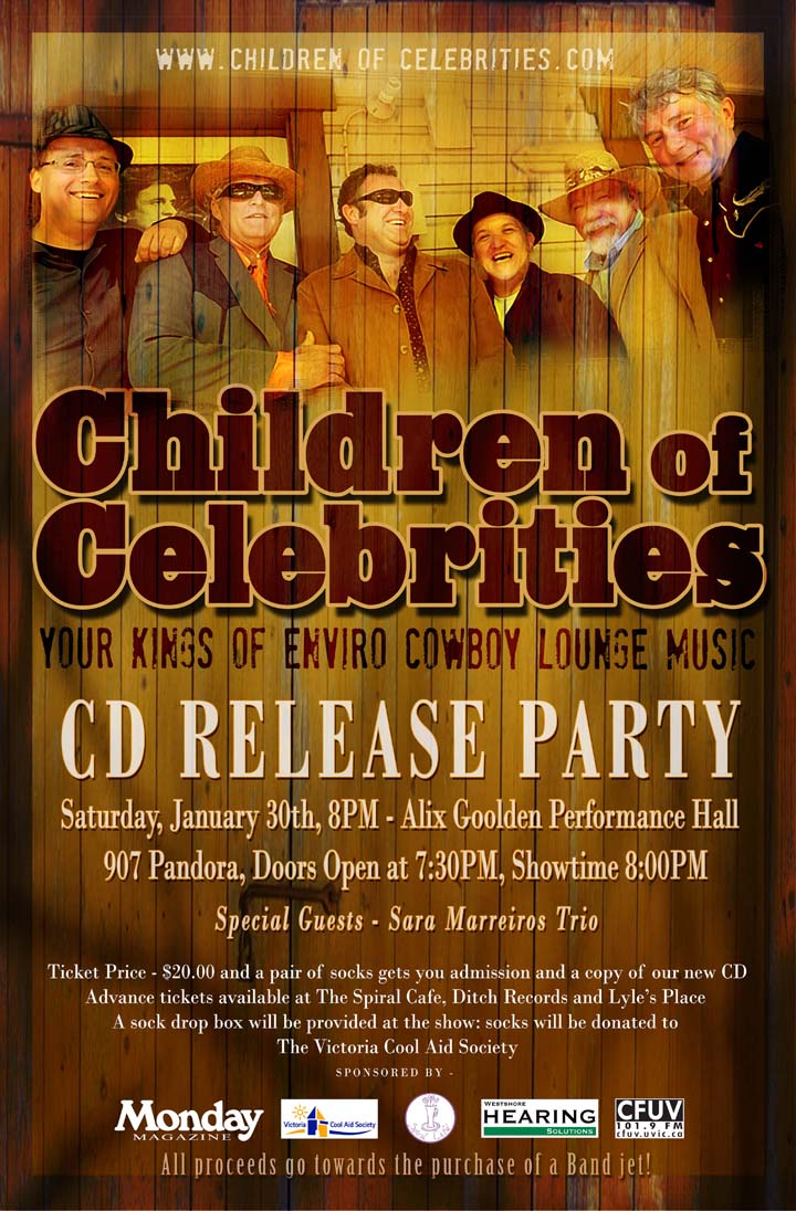Victoria's kings of "enviro-cowboy lounge music" continue their Stereo Bang Bang CD release tour with a stop at the Duncan Garage Showroom. Their smokin' new songs have been receiving airplay on CBC Radio's North By Northwest, All Points West and campus stations such as CHLY and Village 900. In fact the band was recently interviewed in the Times Colonist, Monday Magazine and by all three Victoria TV stations. For the new CD, "Stereo Bang Bang", the band stuck to their goal of capturing the feeling of a live-off-the-floor sound. Recorded in Mike Regimbal's home studio, the new album features eleven originals and two covers: Tom Waits' "Tango 'Til They're Sore" and Johnny Cash's "Let the Train Blow the Whistle." CelebHeads (the band's cult following) and new listeners alike will be right at home with the new songs: "The Road to Hollywood" is a story from the boulevard of broken dreams; "Rodeo Clown" tells the tale of a woman pursuing a non-traditional career; the mean streets of "Downtown" is spiced up with jaw harp and banjitar; "Old Lips" offers a view from the end of the line; and "What Will It Mean When You're Gone", written by Mike Raymer, is a lovely ballad that tugs at the heart strings. Contributing vocals to several songs are members of Victoria's award-winning Balkan Babes.
