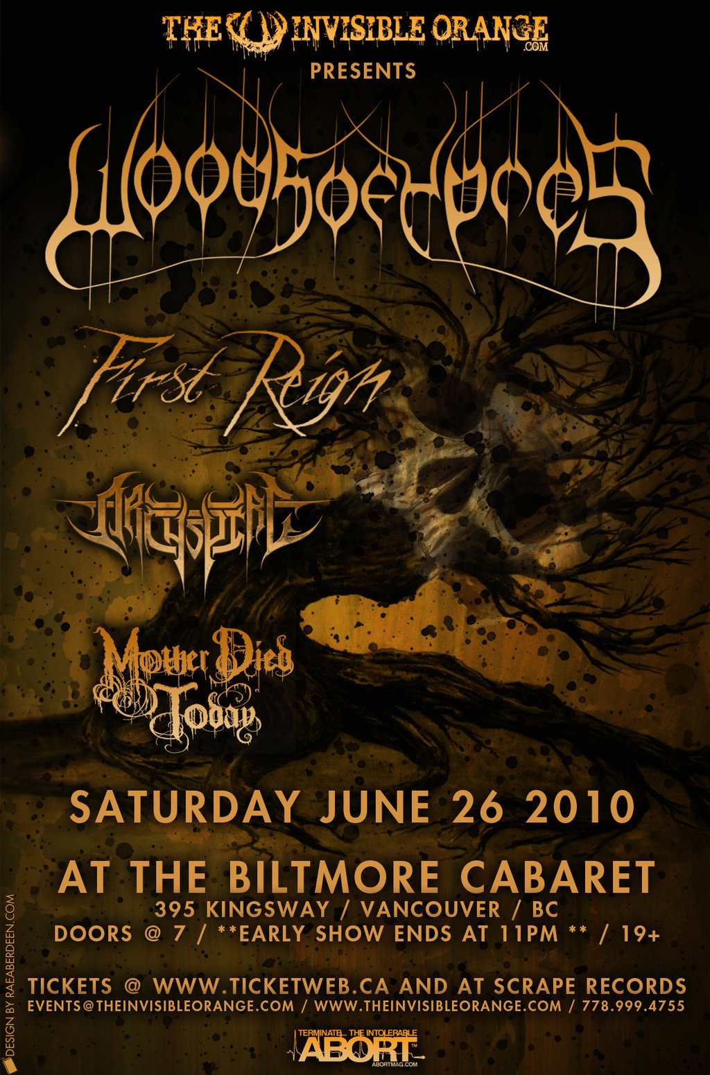 EARLY SHOW!!! 7:25PM: Woods of Ypres, First Reign, Archspire, mother died today @ The Biltmore Cabaret Jun 26 2010 - Feb 11th @ The Biltmore Cabaret