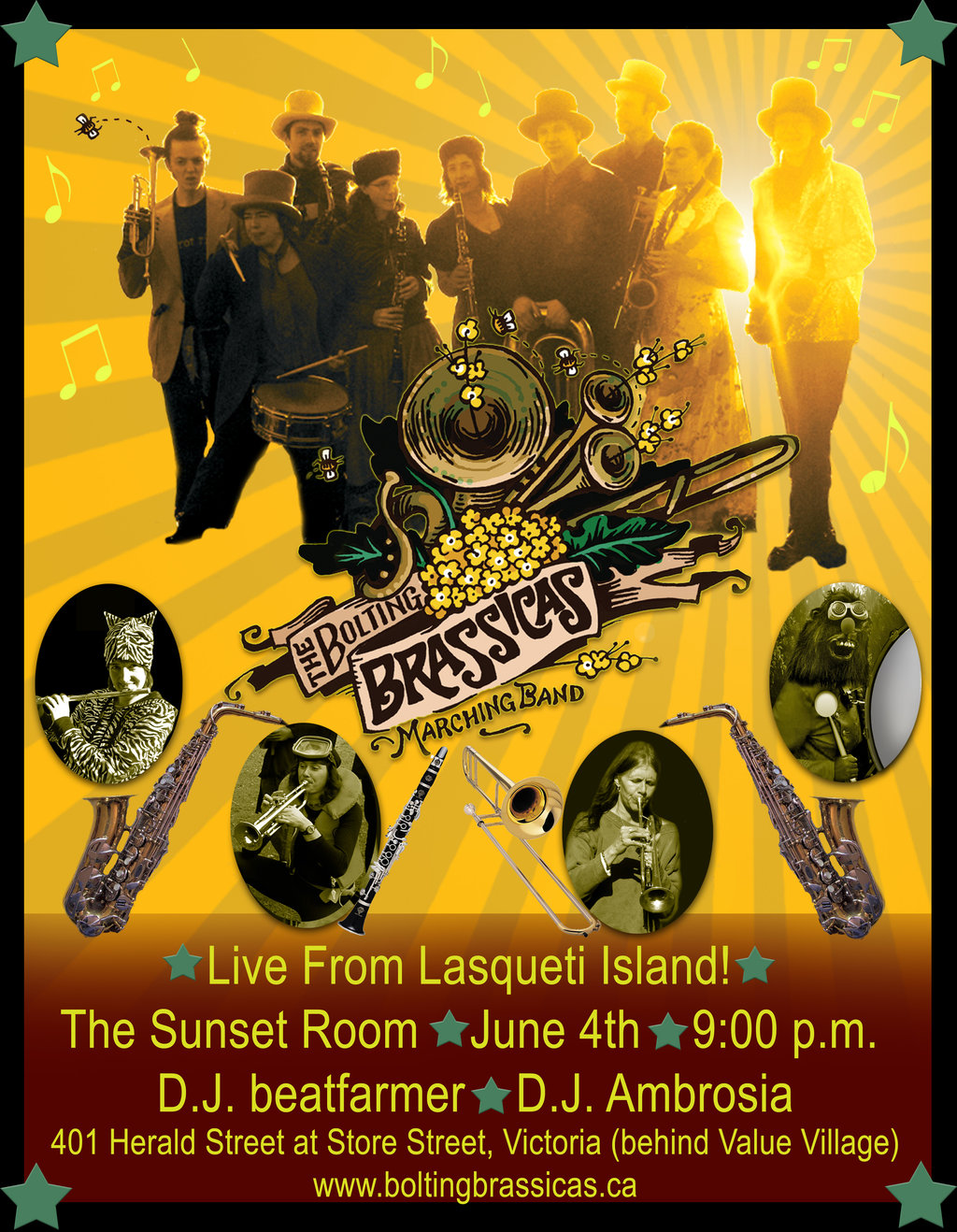 For one show only in the big city!!! Victoria's Sunset Room will rock and thump when a 14 piece Brass and Percussion Marching Band from the untamed wilds of Lasqueti Island are let loose to wow and loot Victoria!