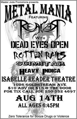 Metal Mania featuring Reaver and Dead Eyes Open: Reaver, Dead Eyes Open, Scimitar, Heavy Indica, Rotten Rails @ Isabelle Reader Theatre Aug 14 2010 - Feb 12th @ Isabelle Reader Theatre