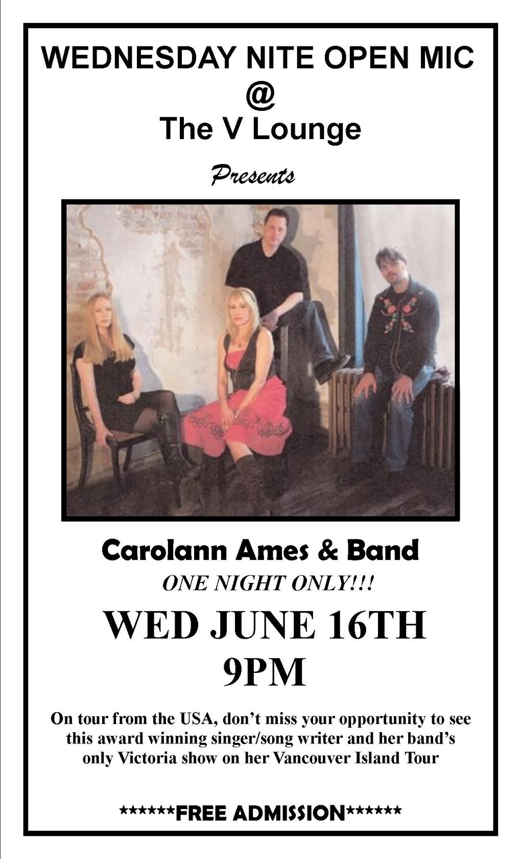 Wednesday Nite Open Mic @ the V Lounge is please to present "Carolann Ames and Band" On the island for a few other gigs, Carolann has agreed to a FREE one night only performace @ the V Lounge. Carolann will be accompanied by some very accomplished musicians, so this will be a "must see" performance. She won the John Lennon Songwrtitting Contest in 2004 and has many other credits to her name (see post). Her music is characterised as Americana / Roots based