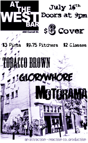 Motorama, Glorywhore, Tobbacco Brown @ The West Bar Jul 16 2010 - Feb 10th @ The West Bar
