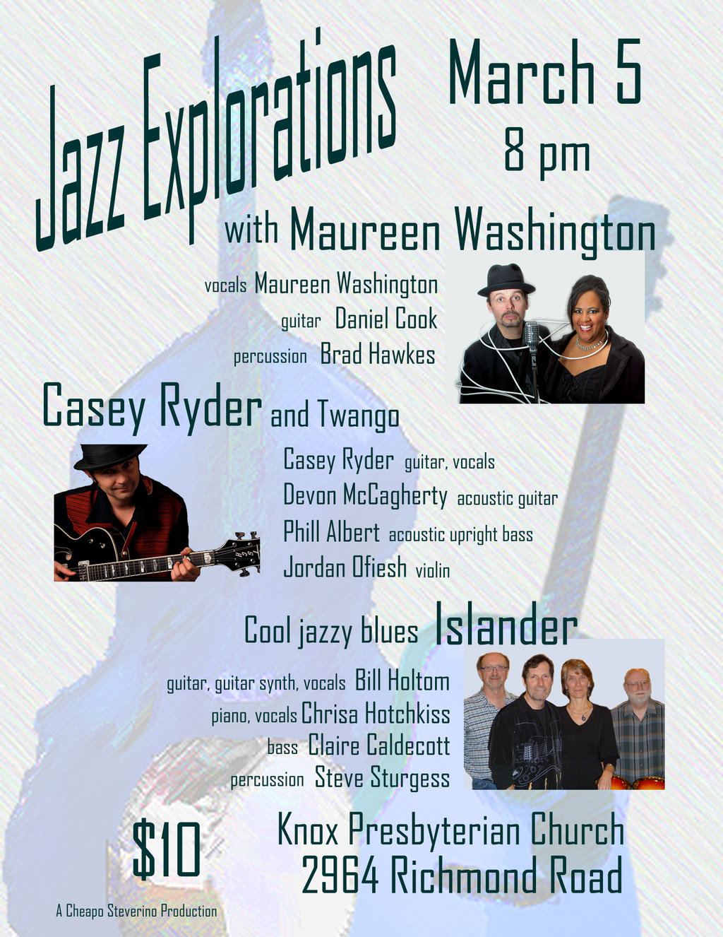 Jazz Explorations with Maureen Washington and Daniel Cook, Casey Ryder and Twango, and Islander with Bill Holtom. Three all-star acts for the price of one!
