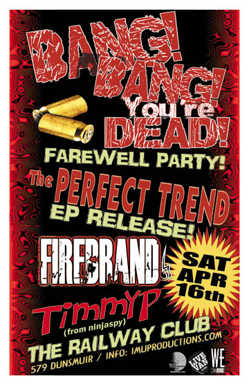 . Saturday, April 16th IMU presents BANG BANG, YOU'RE DEAD! Farewell Party w/ The PERFECT TREND EP Release, FIREBRAND & TimmyP @ The Railway Club, 579 Dunsmuir . 9pm / $10 cover @ the door
