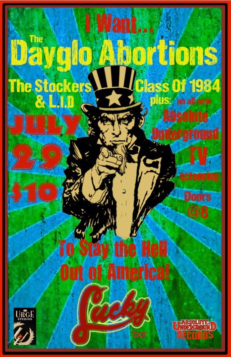 Stay The Hell Out Of America: Dayglo Abortions, The Stockers, Class of 1984, L.I.D., Absolute Underground TV @ Lucky Bar Jul 29 2011 - Feb 11th @ Lucky Bar