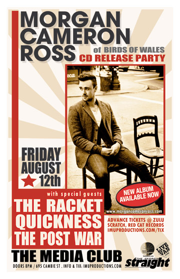 . Friday, August 12th IMU presents MORGAN CAMERON ROSS (of BIRDS of WALES) CD Release Party w/ special guests The RACKET, QUICKNESS & The POST WAR @ The Media Club, 695 Cambie St . Doors 8pm / Purchase advance tickets @ Zulu, Scratch, Red Cat & online @ http://www.imuproductions.com/tix