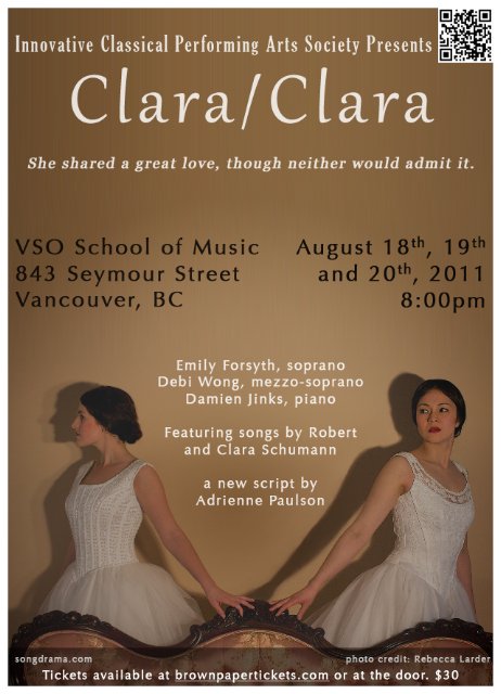 In the mid 19th century when virtually no women were composers or performers, Clara Schumann did both. She was also Robert Schumann's wife and mother of eight. In a new play "Clara/Clara", two actresses simultaneously portray the two sides of Clara's competing priorities � composer/pianist and wife. This light and entertaining play also incorporates compositions of both Clara and Robert that were written during their courtship and 16 year marriage. Montreal soprano Emily Forsyth and Vancouver mezzo-soprano Debi Wong embody the competing identities of Clara Schumann, with Vancouver's Damien Jinks at the piano. Written and directed by Adrienne Paulson. The theme of "Clara/Clara" will resonate with anyone who has ever had to balance Love and Career. At the Pyatt Hall in the new VSO School of Music. Tickets from brownpapertickets.com or at the door.