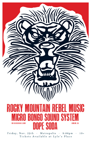 9-piece powerhouse ROCKY MOUNTAIN REBEL MUSIC invites you to an evening of musical grandeur featuring local minstrels of movement MICRO BONGO SOUND SYSTEM and pioneers of pentatonic and pints DOPE SODA. If you enjoy a diverse and unique live show then you will no doubt have the time of your life dancing to all of the fabulous rhythms offered.