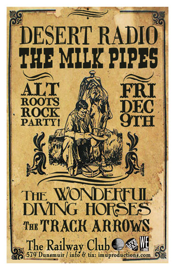 . Friday, December 9th IMU presents DESERT RADIO, The MILK PIPES, The WONDERFUL DIVING HORSES & The TRACK ARROWS @ The Railway Club, 579 Dunsmuir . Doors 9pm / Purchase advance tickets online @ http://www.imuproductions.com/tix
