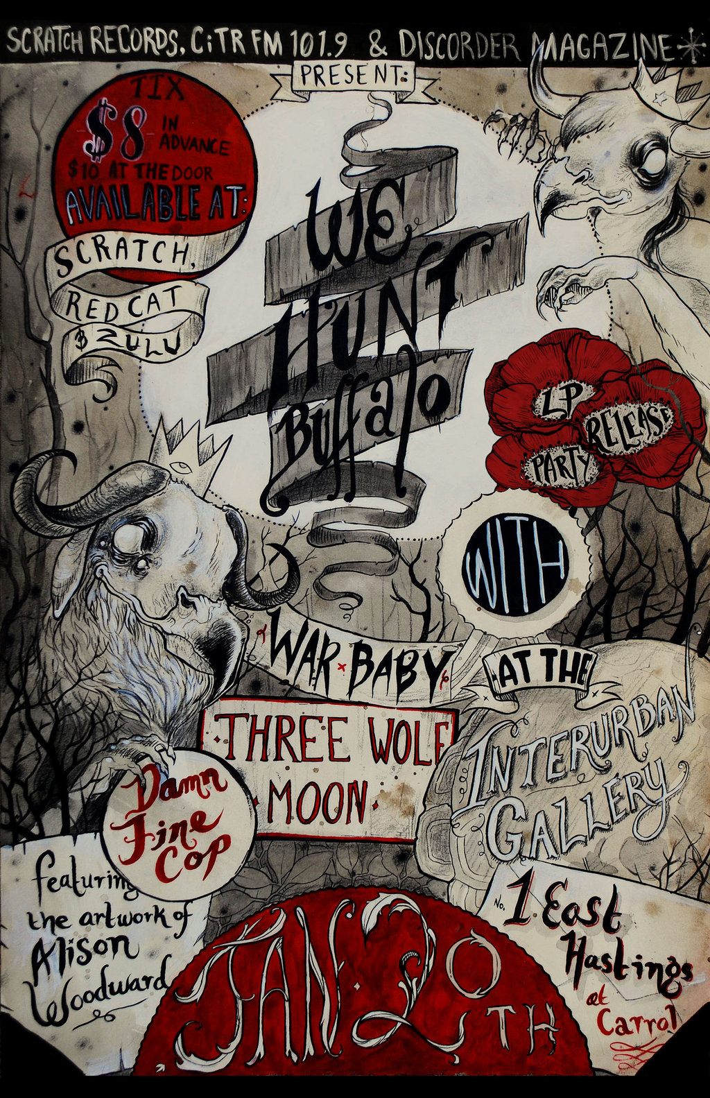 We Hunt Buffalo Record Release Party & Alison Woodward Art Show!: We Hunt Buffalo, War Baby, Three Wolf Moon, DAMN FINE COP, Alison Woodward @ Interurban Gallery Jan 20 2012 - Feb 15th @ Interurban Gallery