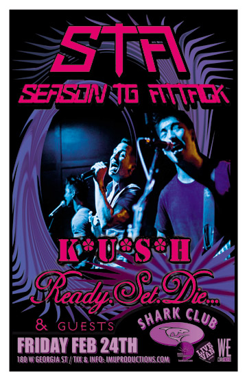 . Friday, February 24th IMU presents SEASON TO ATTACK, KUSH & READY.SET.DIE @ The Shark Club, 180 West Georgia Street . Doors 9pm . Purchase advance tickets directly via the bands & online @ http://www.imuproductions.com/tix