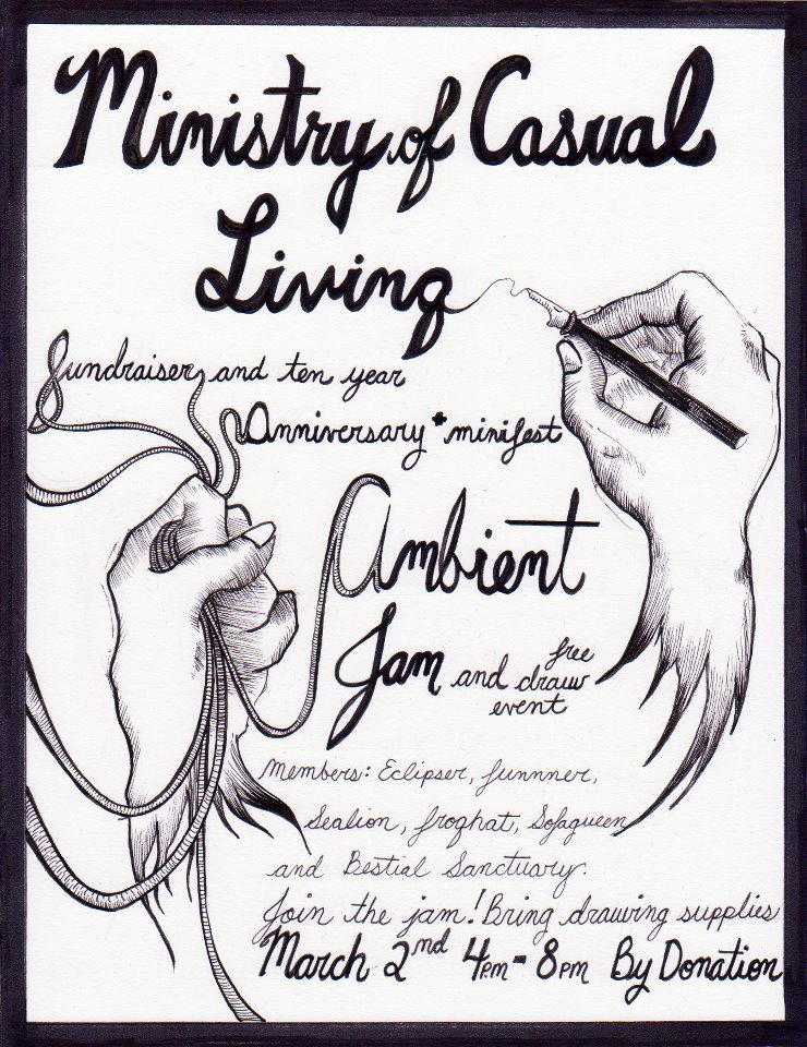 This is an Ambient live PA Jam & Draw, bring sketchpad or art dry media art supplies. Mixer has 8 1/4" inputs, one per artists as a collective ambient drone. Bring audio toys, plug in watch, listen, draw. This is a collective community ambient jam for a collective of artists in a gallery run by other artists. Come and make art. All ages. By donation as a benefit.