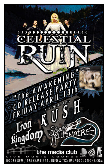 . Friday April 13th IMU presents CELESTIAL RUIN CD Release Party w/ special guests KUSH, SKINNY MILLIONAIRE & IRON KINGDOM @ The Media Club, 695 Cambie St . Doors 8pm / Purchase advance tickets @ directly via the bands & online @ http://www.imuproductions.com/tix