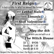 First Reign back in Abby for what has seemed like Forever! With Lethal Halo, Limosis and Stiff Valentine (featuring members of Front Line Assembly)!