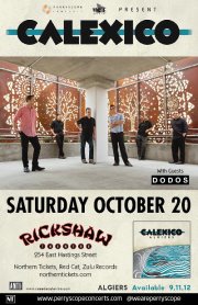 Perryscope Concerts and The Vogue Theatre are excited to announce Calexico with special guests The Dodos, Saturday October 20 at The Rickshaw Theatre. Calexico, a Tucson collective of musicians focused around Joey Burns and John Convertino, forged an eclectic identity through their exploration of Southwestern culture, Portuguese fado, Afro-Peruvian music, and '50s and '60s jazz, country, and surf music. Their studio releases have spanned decades and they will be back to Vancouver again in support of their sixth album, Algiers.