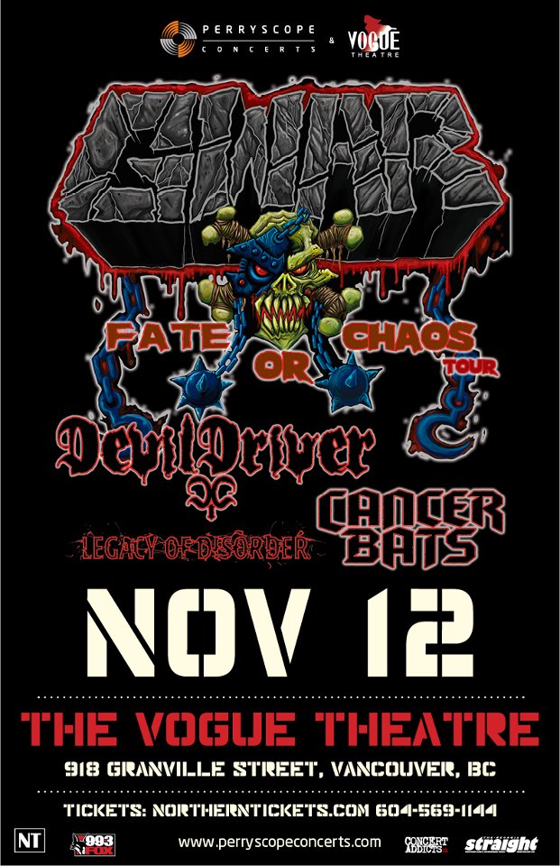 Intergalactic Mutant Overlords GWAR, are plotting their return to the road this fall. Taking a break from working on their new album as well as an extended arctic slumber, GWAR is back with an entirely new show. Your lords and masters will be wreaking havoc across North America, with support coming from DevilDriver, Cancer Bats and Legacy of Disorder. The tour is currently scheduled to kick off October 12th in Philadelphia, PA and run through November 26th in Millvale, PA. Perryscope Concerts & Vogue Productions present GWAR in Vancouver at The Vogue Theatre on November 12. Tickets go on sale Saturday July 28th.
