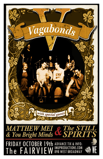 . Friday, October 19th IMU presents VAGABONDS w/ MATTHEW MEI & YOU BRIGHT MINDS & The STILL SPIRITS @ The Fairview, 898 West Broadway . Doors 9pm / Purchase advance tickets directly online @ http://www.imuproductions.com/tix