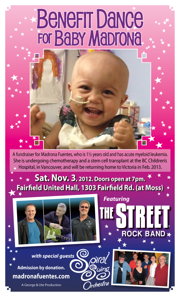A fundraiser for Madrona Fuentes who is 1 1/2 years old and suffering from acute myeloid Leukemia. Benefit Dance Features Two bands: "The Street" and special guests "Spiral Swing Orchestra" Admission is by Donation. Doors open at 7:00. Let's help this young girl and her family!