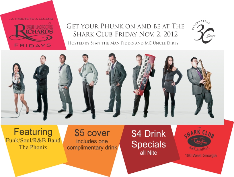 This is a kick-off party for the soon-to-be best Friday night party spot in Vancouver. Beginning in November, THE PHONIX will be performing at the Shark Club EVERY Friday night.