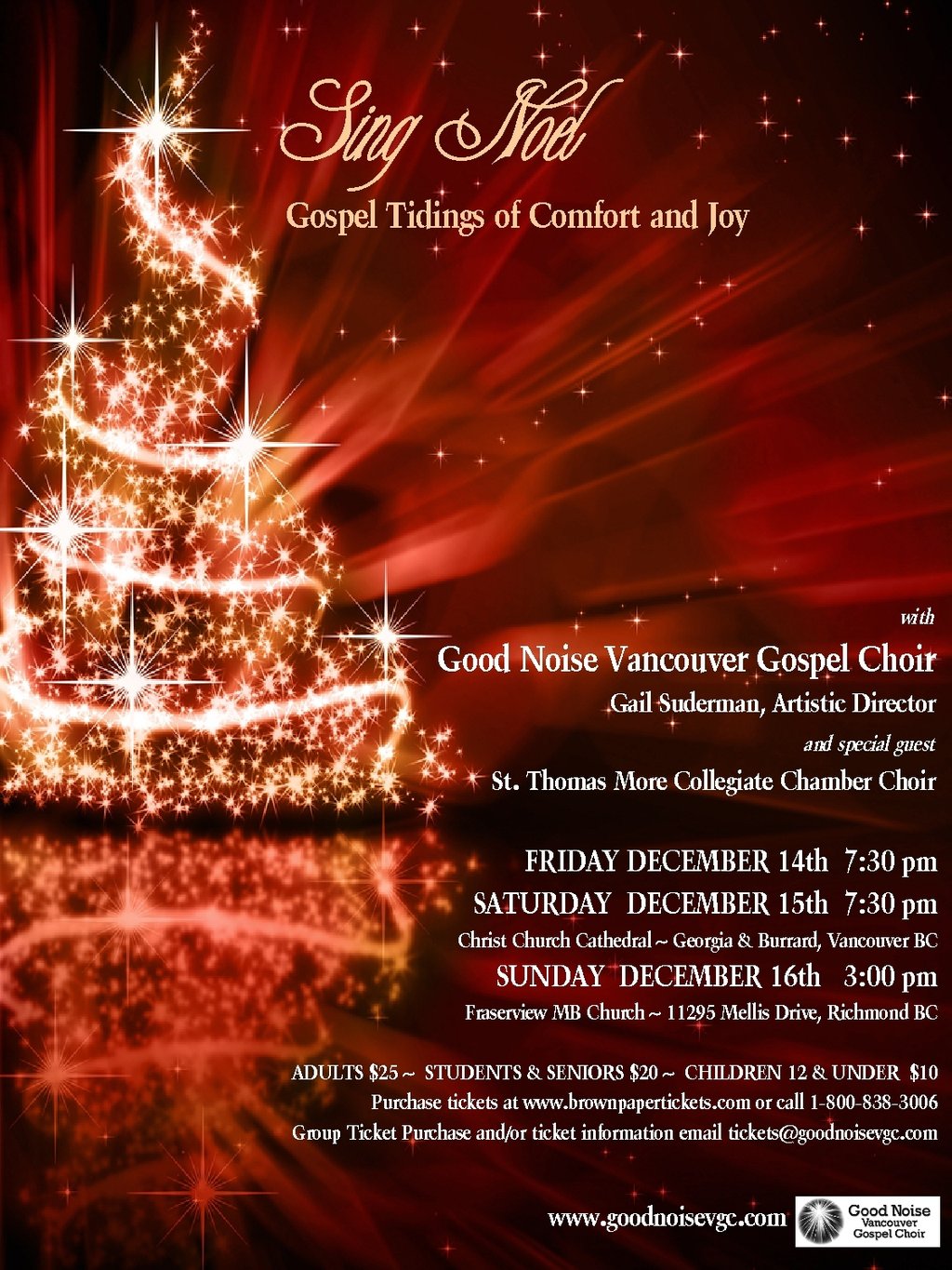 Good Noise Vancouver Gospel Choir presents Sing Noel: Gospel Tidings of Comfort and Joy, a concert series to usher in the Christmas season – with gospel Christmas music and classic Christmas favourites with a gospel flair. Joining Good Noise is the award-winning St. Thomas More Collegiate Chamber Choir, under the direction of Johnson Lui.