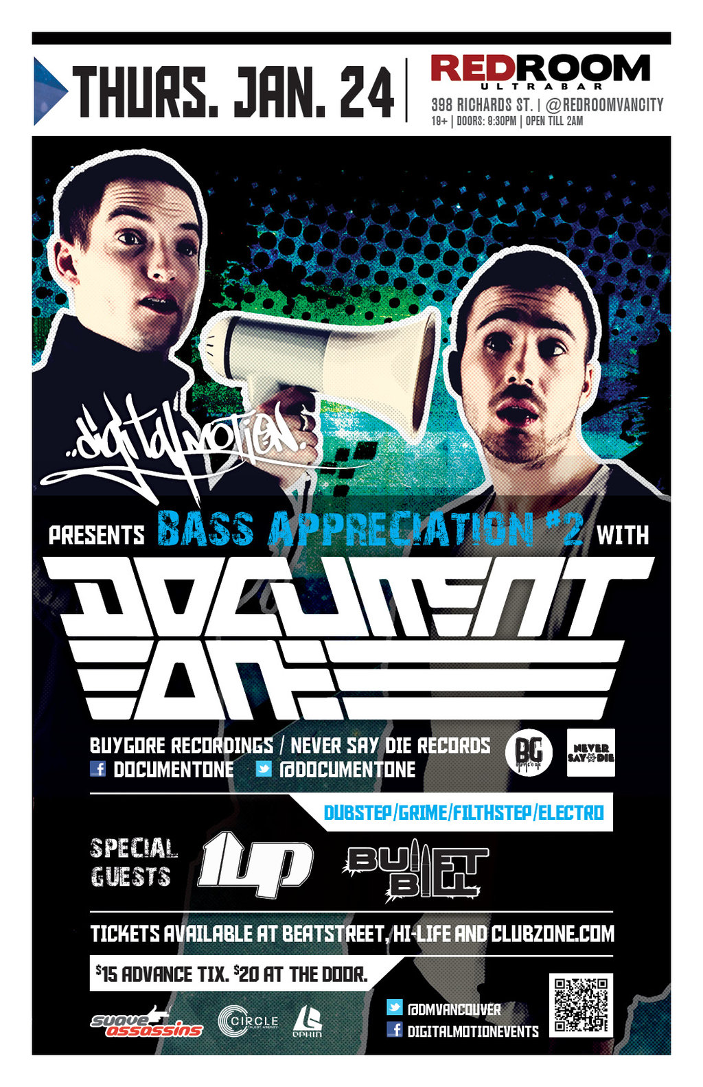 Digital Motion is proud to present you with our first of many bass heavy throw-downs of 2013 with hit UK producers: DOCUMENT ONE , 1uP DUBSTEP, Bullet Bill  @ The Red Room Jan 24 2013 - Nov 15th @ The Red Room