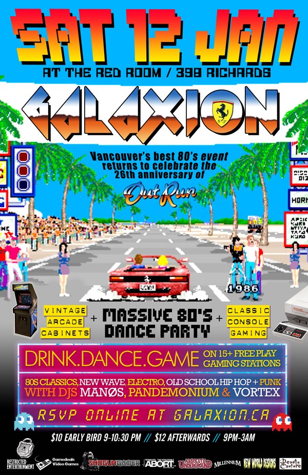 Galaxion is returning to The Red Room on Jan 12 to celebrate the over 26 years of Outrun (we'll have JUST missed the anniversary)! We'll be turning the club into an retro arcade complete with vintage: