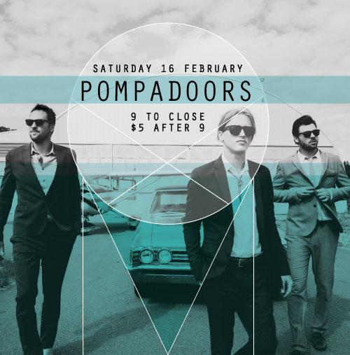 Pompadoors is a Pop-Americana band that formed in Los Angeles, California in 2012. Members Josh Wyper (vocals, keyboards, guitar, drums) with brothers Eric Davis (drums, keyboards, vocals) and Carl Davis (guitar, bass, vocals) got their roots performing cover songs in restaurants on their nights off from touring with their Vancouver based band The Left. The band is best known for creating a comfortable, lighthearted party atmosphere $5 after 9.