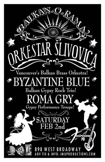 . Saturday, February 2nd IMU presents BALKAN-O-RAMA! featuring ORKSTAR ŠLIVOVICA Vancouver's Balkan Brass Orchestra, BYZANTINE BLUE Balkan Gypsy Rock Trio & ROMA GRY Gypsy Dance Group @ The Fairview, 898 West Broadway . Doors 9pm / Purchase advance tickets online @ http://www.imuproductions.com/tix