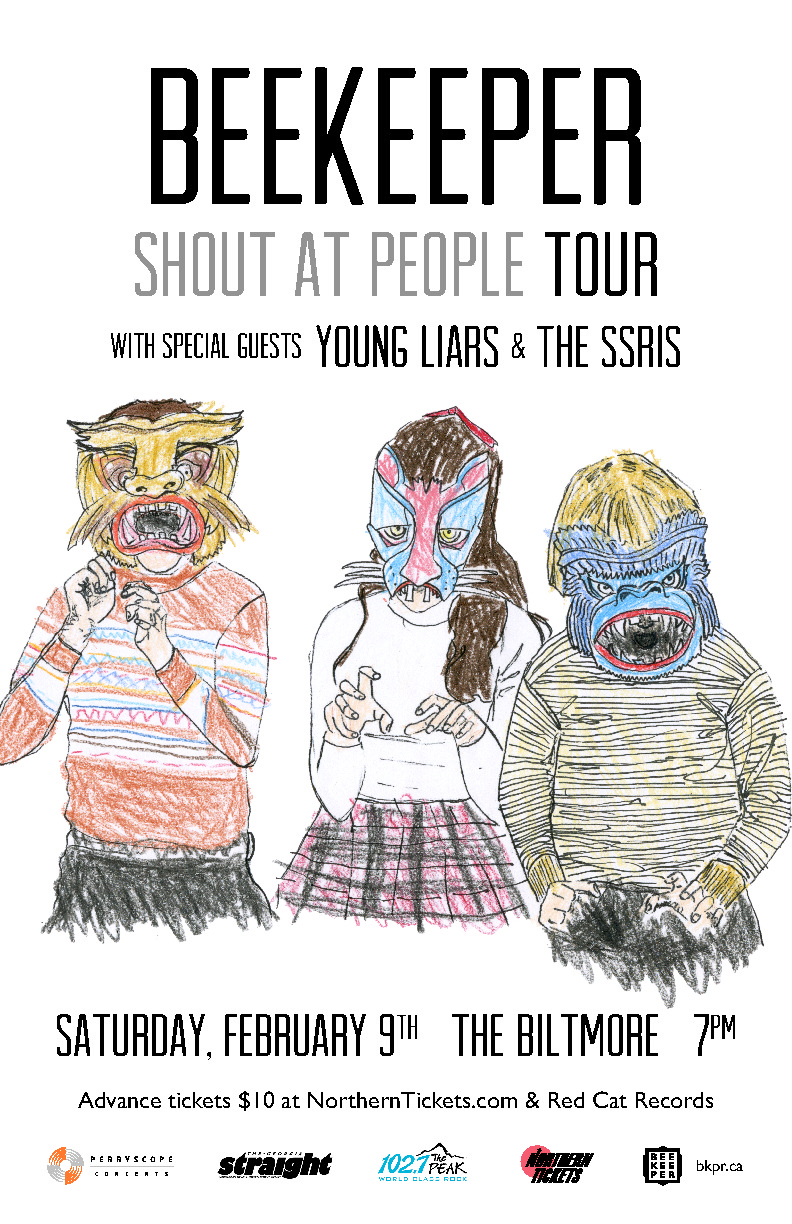 BEEKEEPER can't lay low, because they won't lay low. Much like a jack-in-the-box, this Vancouver based post-pop three-piece will be popping up every which where in 2013, surprising, delighting and perhaps making audiences feel a little scared but in a good way, starting with a headlining event Saturday February 9 at the Biltmore Cabaret. The evening will be a celebration of the release of their brand new EP. And what's a celebration without good friends? Young Liars and SSRIs will be on board for what is sure to be a perfectly perplexing evening of Vancouver rock n roll.