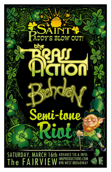 . Saturday, March 16th - St Paddy's Blow Out! The BRASS ACTION, BREHDREN & SEMI-TONE RIOT @ The Fairview, 898 West Broadway . Doors 9pm / Purchase advance tickets online @ http://www.imuproductions.com/tix