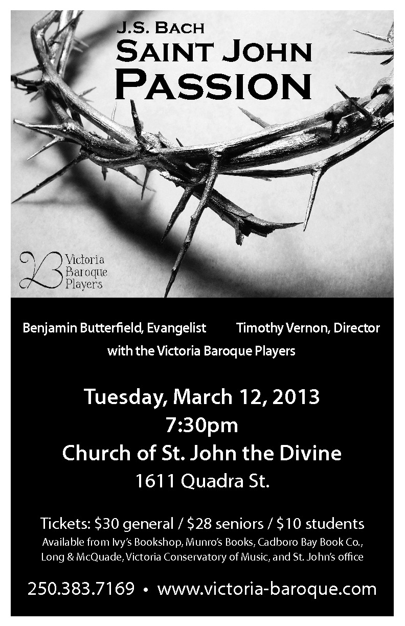 Bach's St John Passion: Victoria Baroque, Timothy Vernon, Benjamin Butterfield, St John's Chamber Singers @ St. John The Divine Mar 12 2013 - Dec 30th @ St. John The Divine