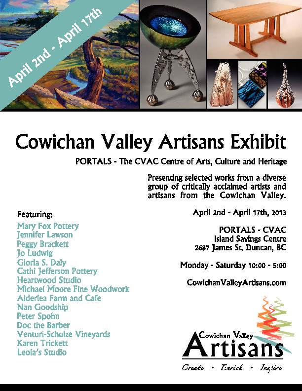 The Cowichan Valley Artisans display their artwork during this 2 week show. Featuring ceramics, glass, jewellery, wood turning, woodwork and paintings, this show is one not to be missed.