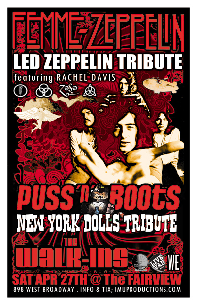 . Saturday, April 27th IMU presents FEMME ZEPPELIN Led Zeppelin Tribute featuring Rachel Davis, PUSS 'N' BOOTS New York Dolls Tribute & The WALK-INS @ The Fairview, 898 West Broadway . Doors 9pm / Purchase advance tickets online @ http://www.imuproductions.com/tix