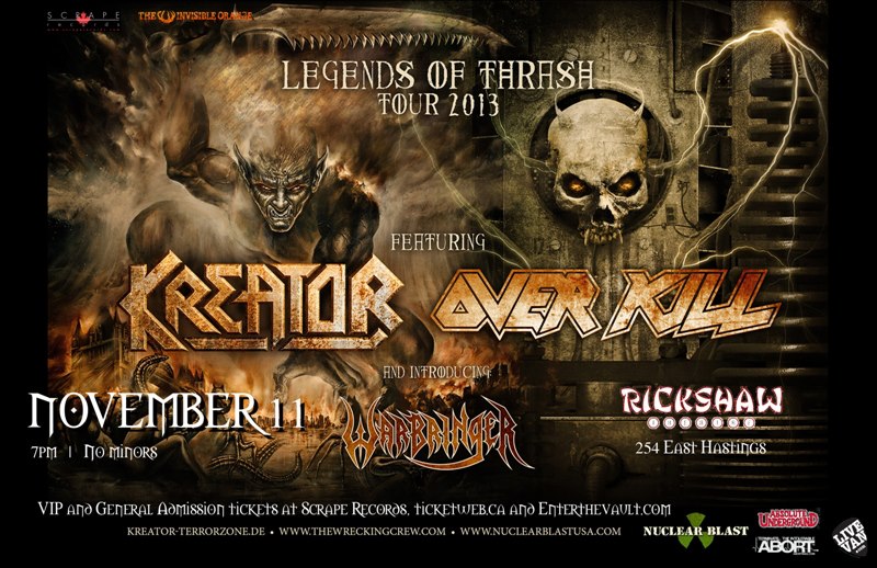 Germany’s biggest export in thrash returns; the band that inspired generations of young bands and has been around for nearly 30 years…. KREATOR! These German legends are back in Vancouver to rip your face off with their newest album release Phantom Antichrist which is steeped in solos, riffs, and the usual Kreator-esque thrash madness. For fans of fast, furious, and air guitar worthy metal, you’ll love the latest release. Kreator’s sounds is said to be radiate similarities between their other German compatriots, Destruction and Sodom; All of which are often credited with helping pioneer death metal, by containing several elements of what was to become the genre of THRASH!