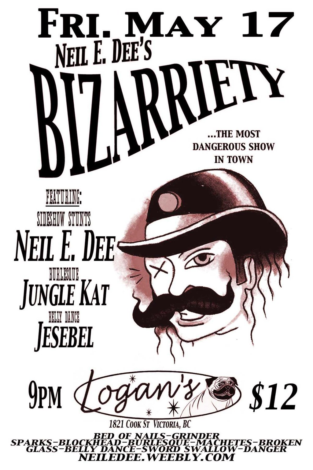Neil E. Dee's BIZARRIETY  sideshow stunts-burlesque-belly dance-variety: BIZARRIETY, Sideshow-Neil E. Dee (Van), Burlesque-Jungle Kat (Van), Belly Dance-Jesebel @ Logan's Pub May 17 2013 - Jan 12th @ Logan's Pub