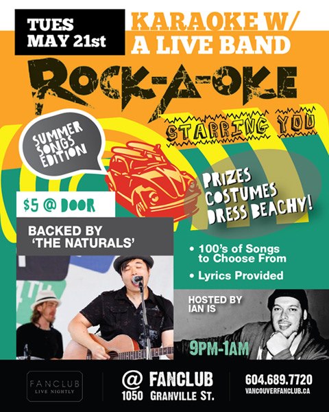 PRESENTING THE 'SUMMER SONGS' EDITION OF LIVE KARAOKE (ROCK-A-OKE) AT FANCLUB. Hosted by The Naturals Band who play live while you choose from their extensive song list for your chance at being a real live ROCK STAR as you sing Karaoke style with a full band!