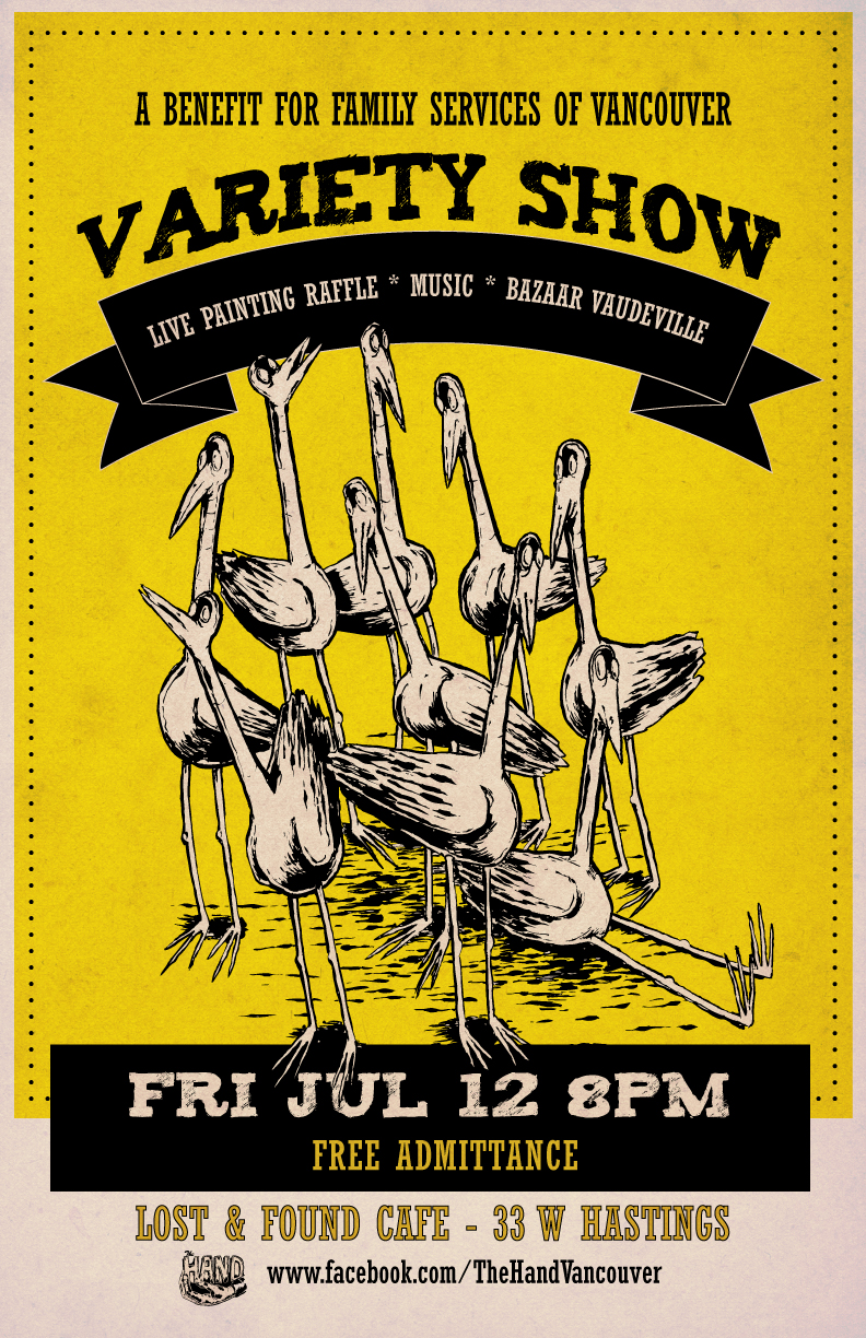 Epic variety show featuring music, live painting raffle, comedy, bazaar vaudeville. All proceeds benefit Family Services of Vancouver.