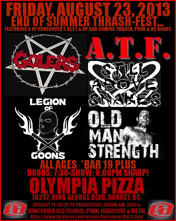 END OF SUMMER THRASH FEST- ALL AGES , BAR 19+: The Golers, A.T.F., STILL ABOVE SNAKES, Legion of Goons, Old Man Strength @ Olympia Pizza, Surrey Aug 23 2013 - Feb 14th @ Olympia Pizza, Surrey
