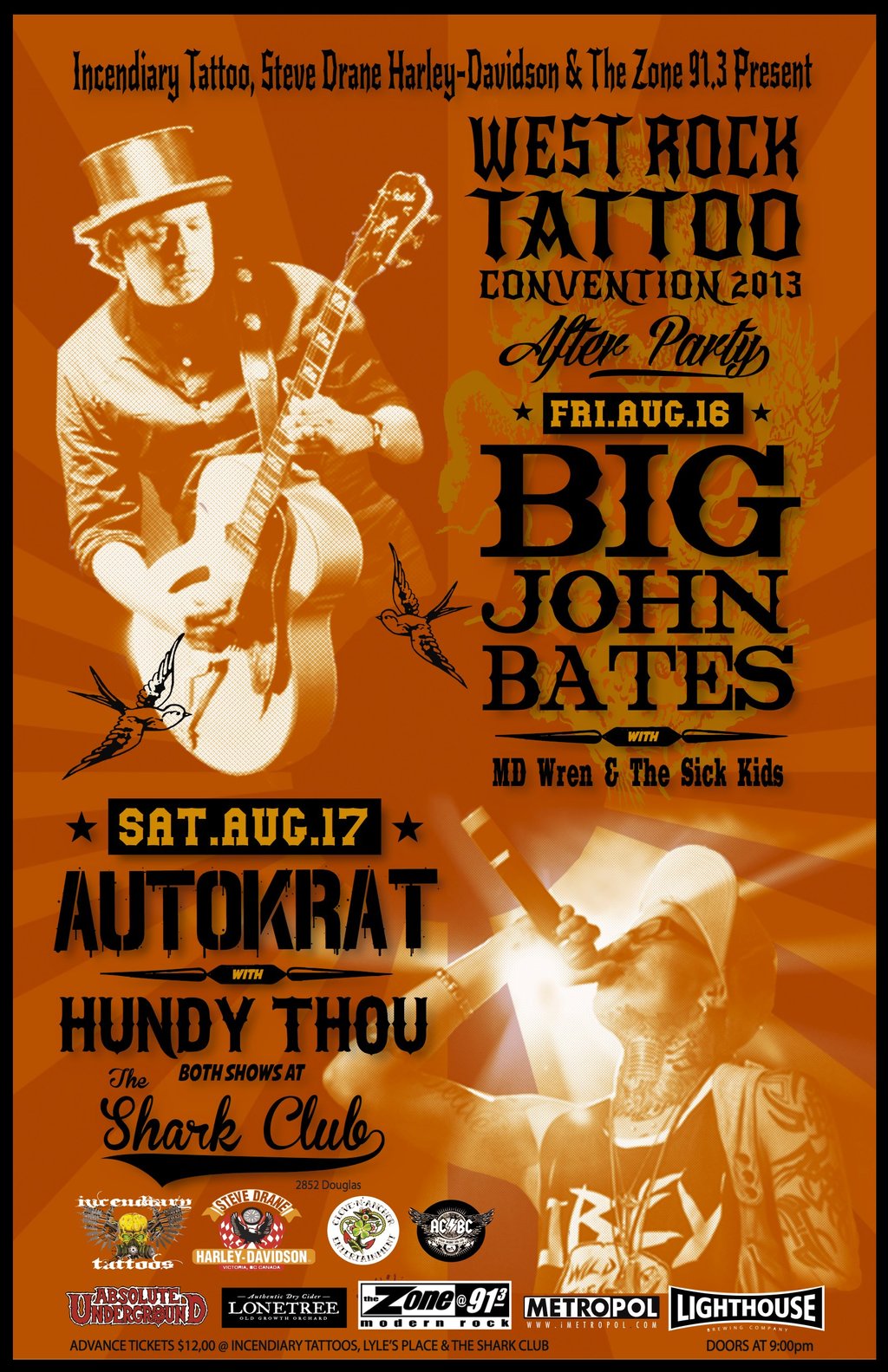 Friday August 16th join us for the West Rock Tattoo Convention after party with Vancouver's Big John Bates and MD Wren & the Sick Kids. Advance tickets available $15 or purchase a weekend pass for just $35 at Lyle's Place, Incendiary Tattoos and Shark Club.