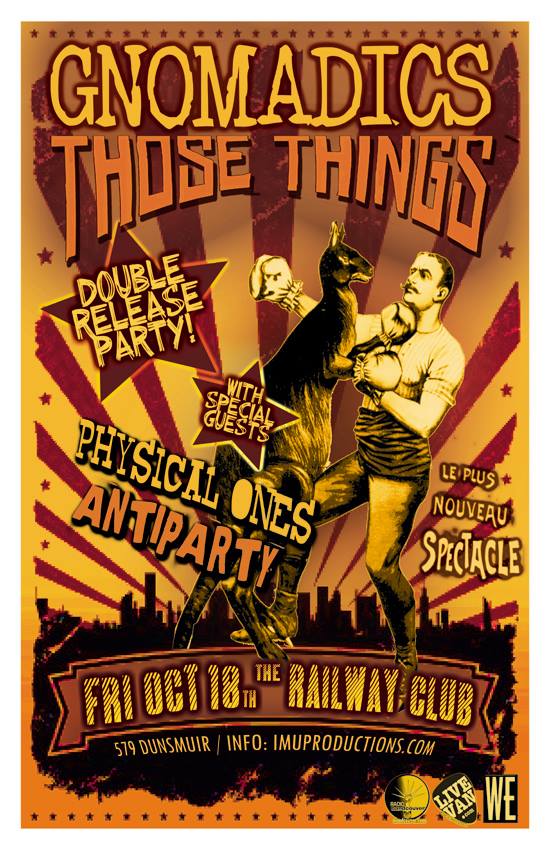 . Friday, October 18th IMU presents THOSE THINGS & GNOMADICS Double Release Party w/ PHYSICAL ONES & ANTIPARTY @ The Railway Club, 579 Dunsmuir . Show 10pm / $10 Cover / Purchase advance tickets online @ http://www.imuproductions.com/tix