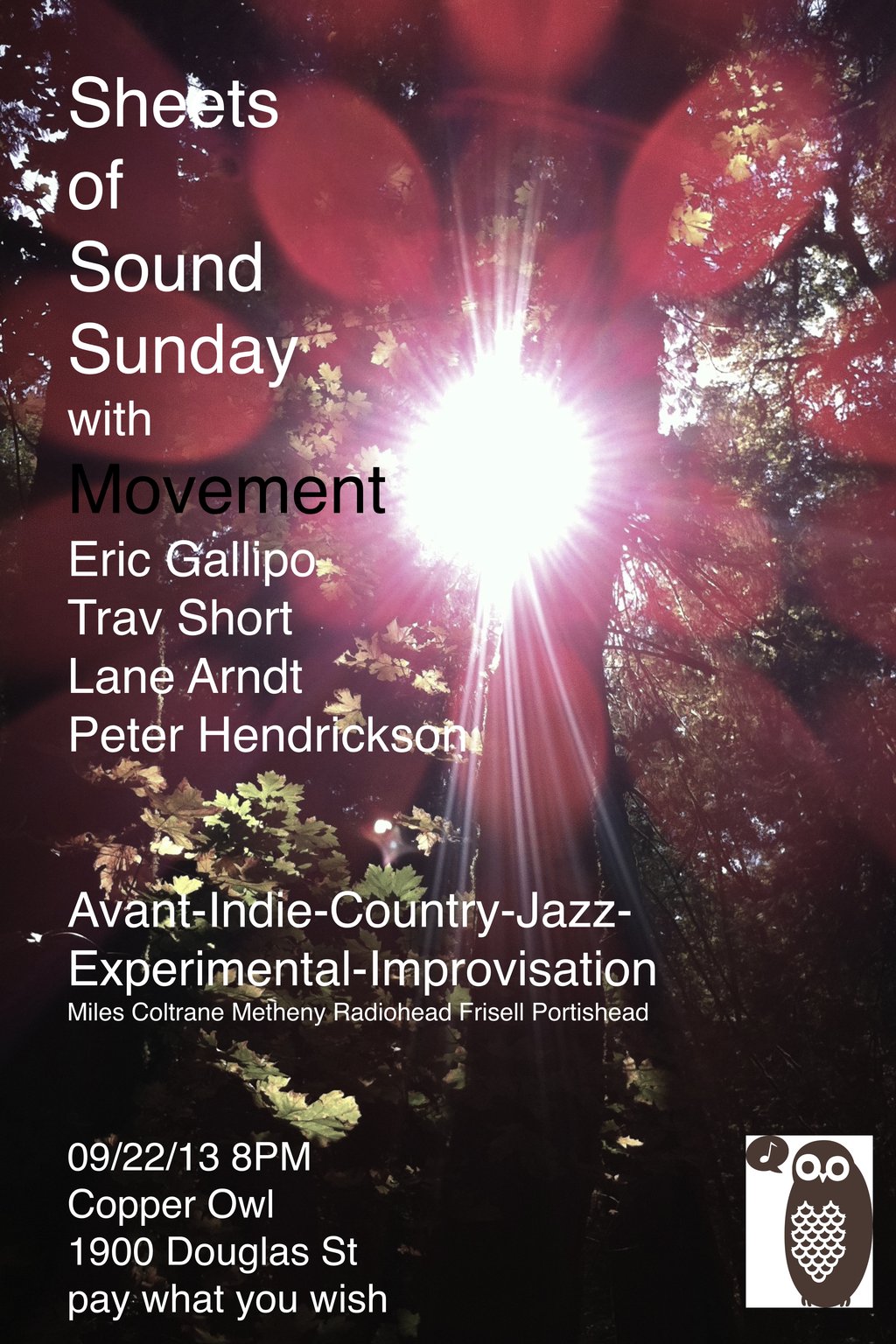 Sheets of Sound Sunday is an evening for the music lover who already knows how great jazz is and also for the uninitiated who suspect it might be as cool as it really is! The name comes from John Coltrane's personal approach to improvisation wherein he would run up and down on the horn in huge streaming clusters of notes attempting for his part, to create the sound of sustained harmony, a technique all but impossible on a single note instrument like the Saxophone! In much the same way, guitarist Lane Arndt is pushed by the limitations of the guitar to push conceptual boundaries and create a liquid and sustained but dynamically shifting texture.