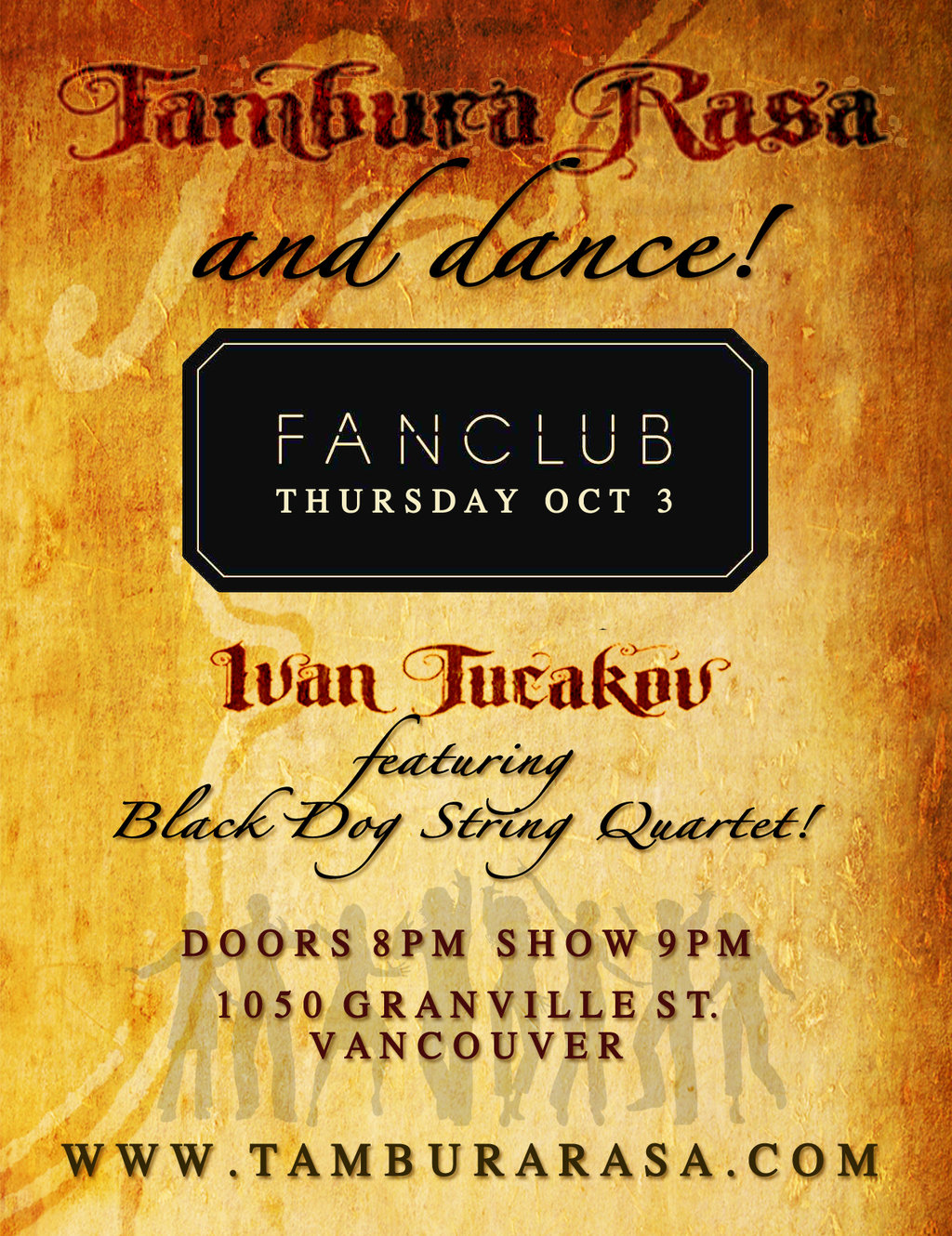 An evening of dancing to Ivan Tucakov and Tambura Rasa's live flamenco, balkan and world grooves accompanied by fully orchestrated string quartet section in Vancouver's favorite new venue, the Fanclub.